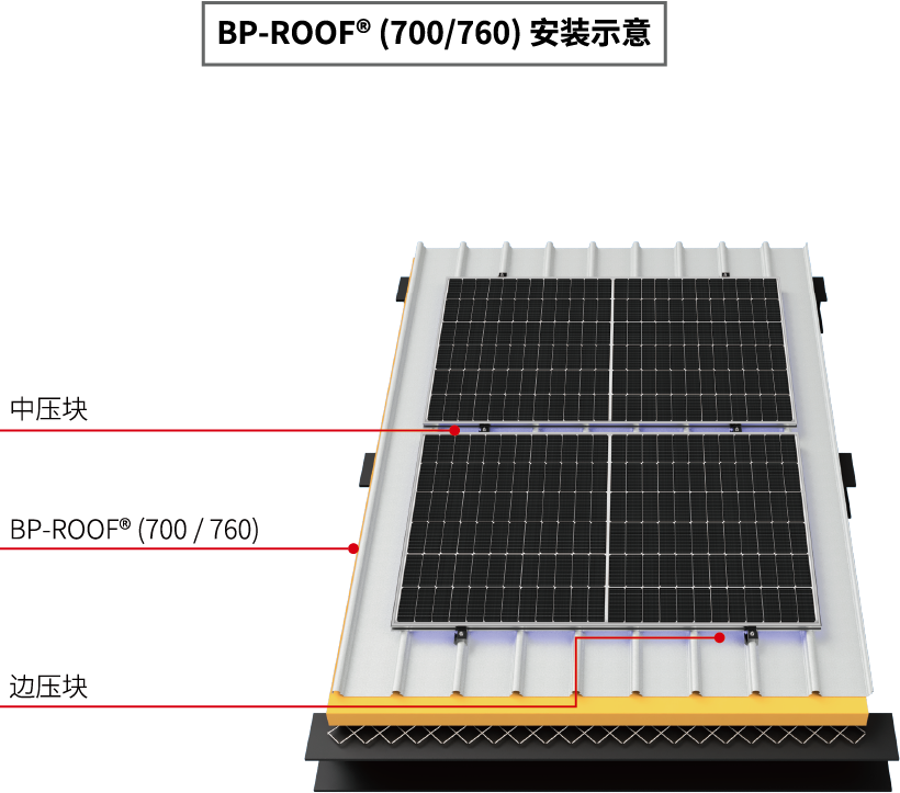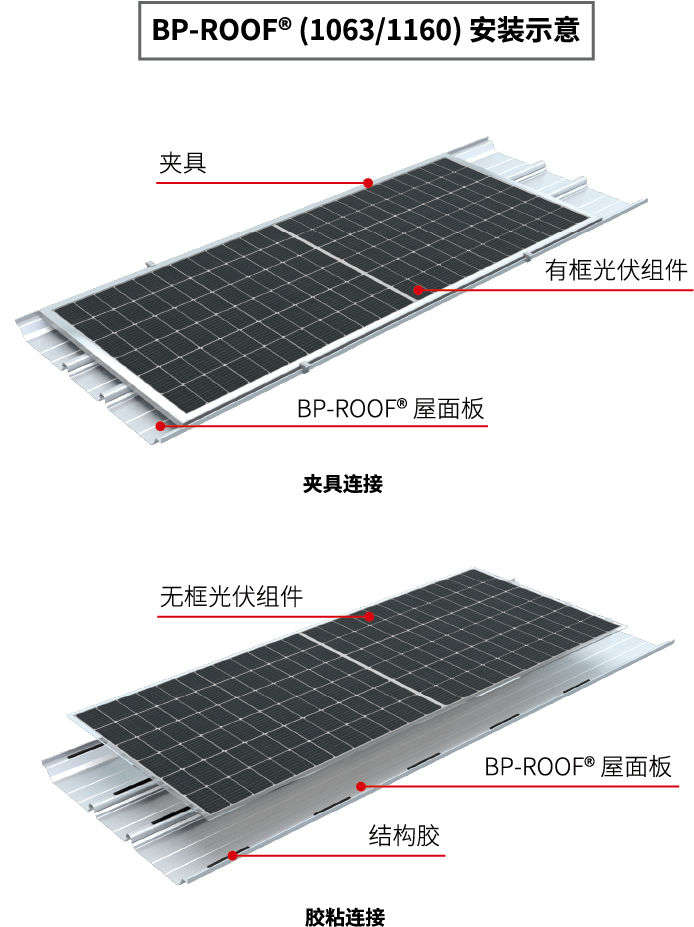 鋼之杰BP-ROOF?光伏專用底板系列:BP-1063/1160、BP-700/760,能適用于行業常規 166/182/210光伏組件,具有完善的節點設計和極佳的安裝方式。